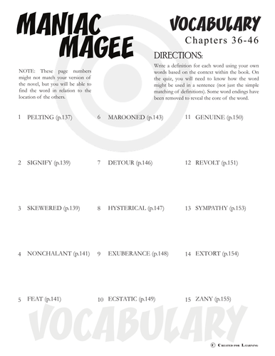 Maniac Magee Vocabulary List And Quiz Chapters 36 46 Teaching Resources